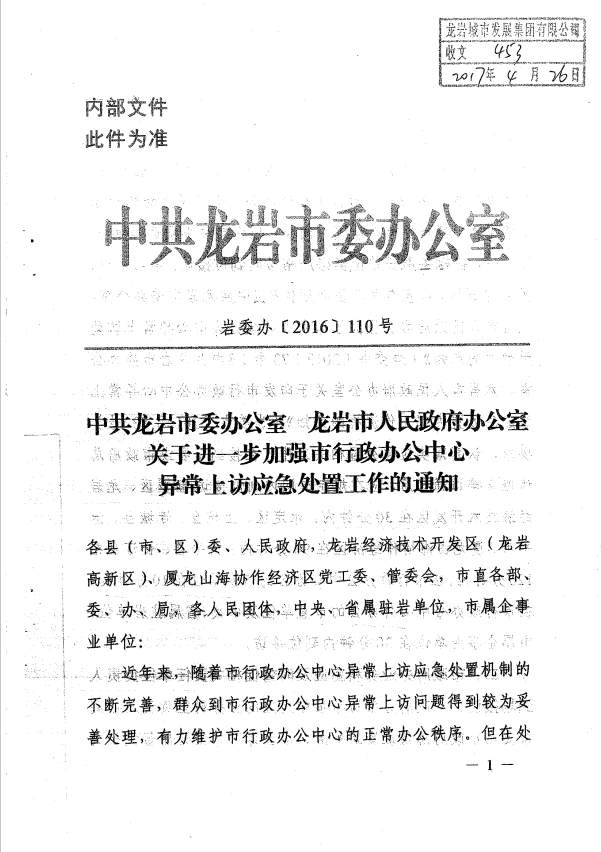 市委辦關(guān)于進(jìn)一步加強(qiáng)市行政辦公中心異常上訪應(yīng)急處置工作的通知(巖委辦【2017】110號(hào))