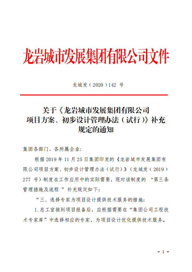 關(guān)于《龍巖城市發(fā)展集團(tuán) 有限公司項目方案、初步設(shè)計管理辦法(試行)》補(bǔ)充規(guī)定的通知